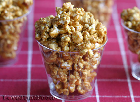 incredibly tasty! This caramel popcorn recipe includes peanuts or cashews (photo above shows it made with peanuts), but you can leave them out if you choose - though I highly recommend making this recipe with peanuts (or cashews), because they add the perfect amount of saltiness to counter the sweetness of the caramel. After mixing the popcorn with the caramel, this recipe requires some baking, which will beautifully and lightly crisp the caramel corn. Some caramel corn recipes do not require any baking, which takes less time to make, but I have found this leaves the caramel corn quite sticky, making it difficult to chew. This recipe produces a full-flavored caramel corn that is baked just long enough (30 minutes) to give it the perfect texture. However, if you prefer a crispier caramel corn (similar to the Cracker Jacks brand), simply bake for 1 full hour, making sure to toss the caramel corn every 15 minutes until done (though the 30-minute baking time gets my vote!). Caramel Corn is fabulous for parties, events, snacking and desserts - and don't forget to try it warm out of the oven!